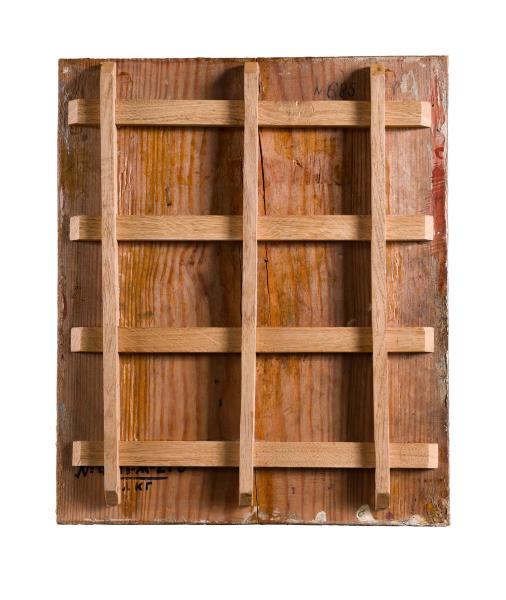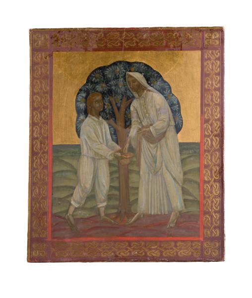 Цей твір, так звана світська ікона «Двоє під деревом» – унікальний іконопис раннього Бойчука, створений у Львові між 1910–1914 роками. Саме в цей час чітко окреслюється індивідуальна творча місія митця щодо створення національного монументального стилю шляхом синтезу візантійських іконописних традицій з декоративізмом і символізмом народного примітиву. Візантійська традиція прочитується у художніх творах львівського періоду (1910–1914) Бойчука: золоте тло, зворотна перспектива й пов’язані з нею умовності в зображеннях. Тоді він намагався переосмислити внутрішню суть біблійних образів і передати їх мовою художника ХХ ст. У цьому сенсі картина «Під яблунею» є програмним твором. Цей твір часто називають іконою, оскільки намальована вона темперою по золоту на дошці в іконописному стилі. Сюжетний образ полотна глибоко символічний – навіяний образом «Плодючого дерева», «Садом» Григорія Сковороди. Центром композиції є дерево. Ця яблуня з плодами – християнський символ, який апелює до моменту гріхопадіння Адама та Єви. Перший рівень іконо-картини – символічний, що відсилає нас до християнської традиції. Такий символізм характерний для народного мистецтва загалом. За принципом симетрії, дерево розташовано посередині іконо-картини й за способом зображення більше нагадує умовно-стилізоване зображення в народному стилі, аніж дерево, зображене в стилі реалістичному. Під яблунею, у найкращих традиціях народного жанру, дві людини – жінка та хлопець, збирають ці плоди, яких так рясно на дереві. Ці постаті теж розташовано за принципом симетрії: один – із лівого, а друга – із правого боку від дерева. Дуже часто в роботах Бойчука та його учнів бачимо зображення «Дерева життя». Архетип «Світового дерева» поєднує уявлення про час, простір, життя та смерть. У роботі також використано середньовічний плетений орнамент, який веде свої витоки від тератологічної язичницької плетінки, він символізує поєднання всього сущого, спадкоємність, він замикає зображення в самодостатній, непорушний світ. Цей унікальний експонат потрапив до ЛНГМ у 1973 році разом із приватною колекцією Ярослави Музики, котра у львівський період життя художника творчо співпрацювала з ним і з колом його послідовників. Ярослава Музика мешкала в будинку на вул. Чарнецького, де була розташована майстерня Бойчука (нині вул. Винниченка, 26), вона зуміла зберегти значну кількість архівних матеріалів і деякі твори, що залишилися після переїзду художника до Києва.
