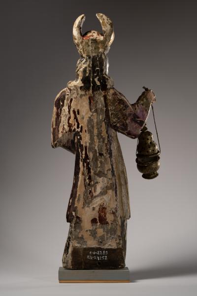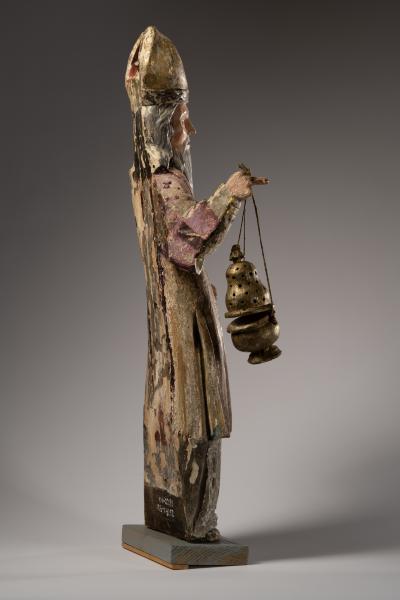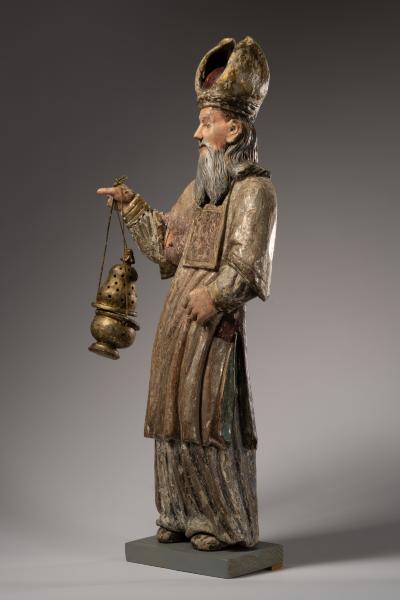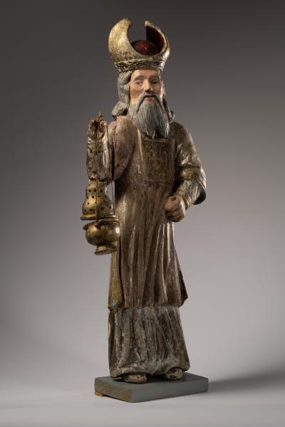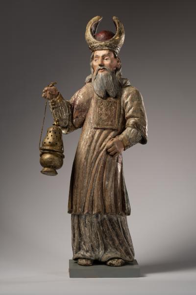 Скульптура презентує пророка Аарона – юдейського первосвященника, брата Мойсея. Він був однією з найбільш значних фігур у Старому Завіті. Класична іконографія зображень пророка сформувалася до X століття. Святого часто зображують у скульптурних оформленнях готичних храмів. Згідно з текстами пророка Єремії, Аарона слід відтворювати як чоловіка старшого віку з довгою бородою, у шатах священника і митрі. Автор роботи відтворив його як старця з сивим волоссям та довгою бородою. Одягнений Аарон у шати первосвященника: тканий лляний довгий хітон та ризу. На голові у нього кідар – закручений з тканини тюрбан. Одним з атрибутів Аарона є чотирикутний нагрудник (пектораль). На ньому в чотири ряди розташовано по три дорогоцінні камінці, на яких були вигравіювані назви дванадцяти колін Ізраїлевих. У правій руці святого зображене кадило, його іконографічний атрибут, один з символів православного богослужіння. Це посудина на ланцюжках, в яку на розпечене вугілля кладуть ладан – запашну смолу східних дерев. Скульптура відтворена з видовженим овалом обличчя, високим чолом, виразними мигдалеподібними очима та клиноподібним носом. Лице святого обрамлюють довгі ритовані пасма сивого волосся і борода, що опускається на груди. Статичний образ святого Аарона підкреслюють прямі вертикальні складки шат, що плавно опускаються донизу.