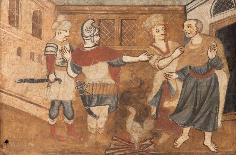 Два клейма відображають сюжети «Зречення апостола Петра» та «Бичування Христа». Зображення привертають увагу простотою, безпосередністю та виразністю рисунка, увагою маляра до деталей. «Зречення апостола Петра» – новозавітний сюжет, який описує передбачену Ісусом подію. Під час Тайної вечері апостол Петро зрадив Христа, а після його арешту тричі зрікся свого Вчителя. Коли заспівав півень, Петро згадав Ісусові слова і розкаявся. Малярі надавали особливого значення цьому сюжету, часто підкреслюючи характерну деталь, – зображення півня, що можна спостерігати й у цій іконографічній композиції. Лаконічною образною мовою художник зумів відобразити драматичний сюжет з урівноваженою композицією, у колористичному вирішенні якої домінує тепла колірна гама.