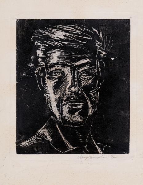Погрудний портрет чоловіка з коротким вихрастим волоссям, зображеного в анфас.
