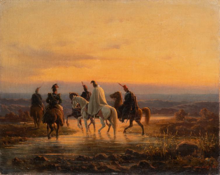 На тлі низького горизонту зображено п’ятьох вершників, які переходять водойму вбрід. Це розвідувальний загін легкої кавалерії, який з настанням сутінків проникає у стан ворога. На передньому плані два офіцери: один з них на білому коні, в білому плащі й у шоломі з гребенем. Вершник ліворуч від нього змальований у мундирі з еполетами та у конфедератці. Решта кавалеристів – у темно-синіх мундирах та ківерах з червоними султанами. Усі фігури на картині зображені зі спини. Половину композиції займає жовтувато-червоне сутінкове небо. Останні промені призахідного сонця відбиваються у воді та забарвлюють собою все навколо. Автор майстерно передає атмосферу напруженої тиші, в якій відбувається розвідка.