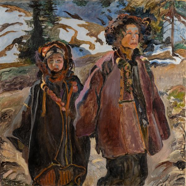 На тлі де-не-де вкритої снігом полонини поколінне зображення двох дітей у гуцульському вбранні. Діти, ймовірно, брат і сестра. Саме одяг видає їхнє соціальне становище – можливо, їм доводиться жебракувати. Старший брат веде за собою молодшу сестру, закутану в декілька хусток. Темні брунатні кольори, в яких виконана робота, передають тяжкий емоційний стан дітей-сиріт: дівчинка має втомлений вигляд, приречено й безвольно йде слідом за братом; на обличчі хлопця читається сум і неспокій.