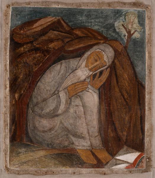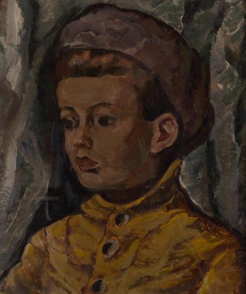 Камерний портрет молодшого сина художника, виконаний в техніці імпасто. На всю висоту вертикальної композиції – погрудне зображення маленького хлопчика в легкому півоберті вліво. Сріблясто-сіра драперія, яка слугує тлом для портрета, гармонійно відтінює одяг дитини: жовто-коричневу сорочку з високим коміром і фіолетовий берет. Хлопчик має втомлений вигляд від позування і сумно дивиться кудись убік. На звороті портрета під час реставрації 2021 року було виявлено та атрибутовано іконографічне зображення святого Антонія Великого, виконане темперою. Зображення було приховане під шаром фарби білого кольору. На картині змальований старець із довгою білою бородою у світло-сірих одежах, що сидить перед входом у печеру. Біля його босих ніг на землі лежить розкрита книга. Голова святого нахилена до долоні лівої руки, права рука лежить на колінах. Очі чоловіка заплющені. Робота містить атрибути, притаманні іконографії святого (печера, книга, дерево). Художник зобразив Антонія Великого в момент молитовного спокою – він ніби нахилився до міжгір’я і слухає. Така сцена відповідає тексту легенди про життя святого. Микола Федюк неодноразово звертався до сюжетів, пов’язаних із життям Антонія Великого, у графічних серіях 1920-х років, зокрема у творах «Спрага», «Спокуса святого Антонія». За стилістикою сюжет також близький до іншої ранньої роботи М. Федюка «Іван Вишенський». Це дозволяє припустити, що даний твір також було створено у 1910–1920-х роках.
