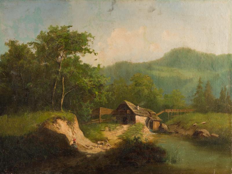 Мальовничий літній пейзаж з водяним млином на тлі порослих густим лісом високих пагорбів. На передньому плані праворуч – плесо річки з пологими берегами. Ліворуч на освітленій яскравим сонцем піщаній стежині, що веде до млина, пасеться коза з козенятами. Поруч них біля підніжжя пагорба сидить пастушка у червоній хустці та синій спідниці з білою сорочкою. Небо у творі ясне, з легкими прозорими хмаринками.