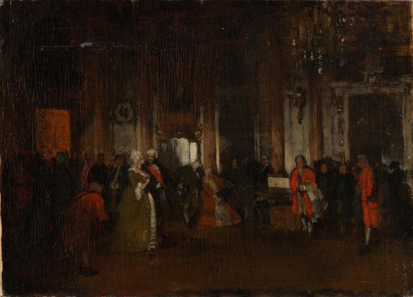 Робота над багатофігурною композицією була розпочата Чахурським ще під час його навчання у Мюнхенській академії мистецтв, проте так і залишилася на стадії ескізу. Художник звертається до епохи XVII століття. Зображена велика напівтемна бальна зала палацу. Бал вже завершився і значна частина гостей роз’їхалася, тому зала змальована напівпорожньою. Лакеї у червоних лівреях очікують розпоряджень. Смисловим акцентом картини є зображена ліворуч пара, до якої прикута увага присутніх: молода жінка у темно-зеленій сукні з мереживом і чоловік у темному камзолі з червоною стрічкою через плече. Шляхетна дама, вочевидь, спізнилася на бал, але вшанувала своєю присутністю господаря, який проводить її через залу. Лакеї шанобливо схиляються перед ними.