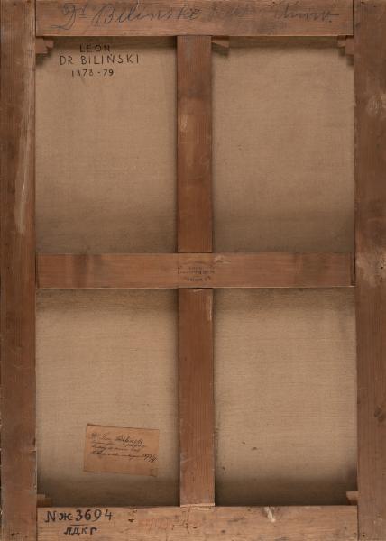 Внизу праворуч авторський підпис: «К. Pochwalski». На звороті наклейка з написом: «Dr. Leon Biliński. Profesor ekonomii politycznej urodzеny 15 czerwca 1846. Rektorem u roku naukowym 1878/9».