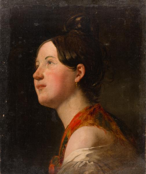 Романтичний жіночий портрет роботи Якуба Процінського є копією картини «Дівчина з хусткою» відомого австрійського портретиста ХІХ століття Фрідріха фон Амерлінга (1803–1887). На темному тлі на всю висоту вертикальної композиції – погрудне профільне зображення дівчини з червоною квітчастою хусткою на шиї. Миловиде рум’яне обличчя панянки обернено вліво, замріяним поглядом вона дивиться угору. Темне волосся недбало підібране у високий жмут на маківці. З прикрас – маленькі сережки. Біла сорочка ледь прикриває плечі. Портрет виконаний у теплих яскравих кольорах.