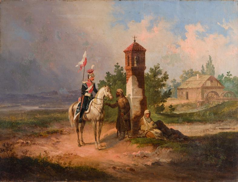 Прямокутна горизонтальна багатопланова композиція. Сюжетно-смисловий центр картини, який збігається з центром полотна, художник виділяє світлом. На передньому плані на роздоріжжі біля стовпа-каплиці з червоної цегли зображена родина жебраків. Втомлена жінка у білій хустці з немовлям на руках сидить на землі під стовпом, а її чоловік, спираючись на милицю і палку, просить милостиню у проїжджих. Художник змальовує момент, коли до них під’їжджає молодий польський улан на білому коні. За спиною у нього спис із біло-червоним прапорцем. Улан подає милостиню чоловікові й, можливо, щось говорить до нього. На задньому плані праворуч на тлі зелених дерев зображений водяний млин. Ліворуч позаду ледь видно річище, що губиться на горизонті. Персонажі та предмети як переднього, так і заднього плану детально промальовані. Половину композиції займає дивовижно мінливе, як і людське життя небо – темне дощове з однієї сторони (над річкою) і ясне блакитне з легкими хмаринками з другої сторони (над млином).