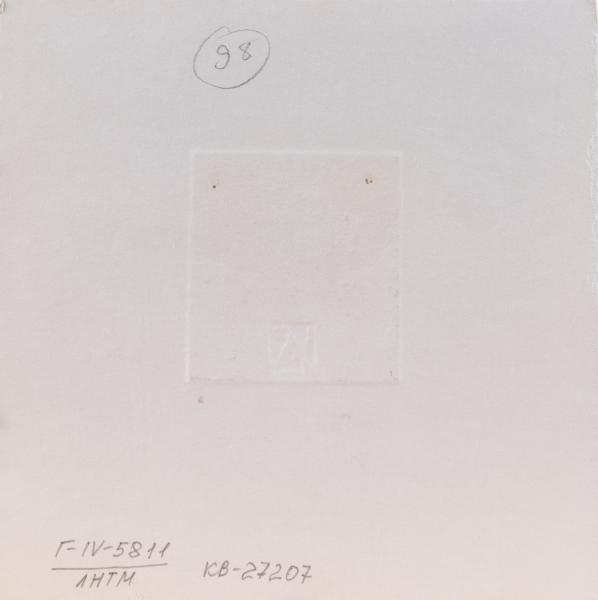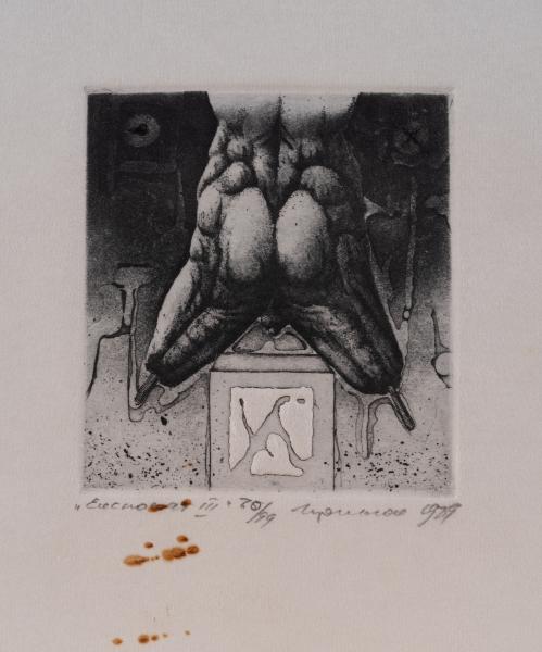 Монохромний чорно-білий відбиток (5.3 х 4.9 см). Посередині на фронтальній площині постаменту зображені білі тиснені плями, скомпоновані у форму квадрата. На постаменті відтворено частину торса чоловіка, поверненого спиною до глядача. Верхній край відбитка обмежує спину на рівні лопаток. Розставлені у різні боки ноги обрізані або ампутовані вище колін. З ніг стирчать тонкі малі відрізки стрижнів або кісток. Світло-сірий фон композиції внизу переходить до темно-сірого вгорі. На ньому – світлі плями, обведені чорним контуром. Біля верхнього лівого кута роботи – кругла світла пляма з товстою цяткою у центрі. Біля верхнього правого кута – світла кругла пляма з чорним косим хрестом всередині.