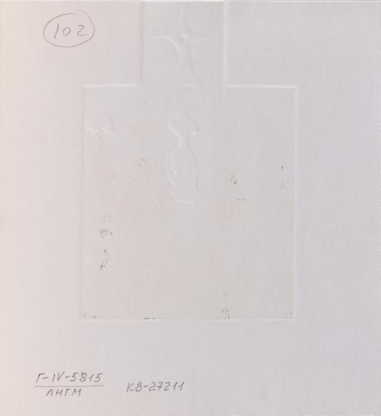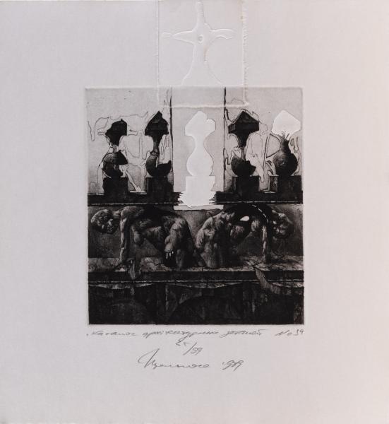 Монохромний чорно-білий відбиток (13.8 х 9.1 см) з білим тисненням вгорі аркуша. На відтиск посередині вгорі було попередньо наклеєно прямокутник (4.7 х 3.6 см) з такого ж паперу. Триярусна композиція із зображенням двох оголених жінок у поєднанні з архітектурною спорудою і деталями. На першому ярусі відтворений кам’яний надщерблений місток з трьома консолями під поздовжньою плитою. На другому ярусі – лисі жінки, нахилені вниз. Жінки торкаються одна одної сідницями, їх руки до половини передпліччя встромлені у плиту нижнього містка. Їх ноги до половини стегон встромлені у ту ж плиту. Обличчя жінок звернені до плити; на спинах – чорні плями. Їхні спини підтримують кам’яну балюстраду (третій ярус), що складена з балки й стовпців, утворених поєднанням геометричних елементів кулястої, конусної, призматичної та пірамідальної форми. Стовпці надщерблені. Білим тисненням виконані середній і верх крайнього правого стовпця. Над середнім – біле тиснення у формі хреста. Фон композиції темно-сірий внизу і світло-сірий вгорі, з контурним обведенням плям.x