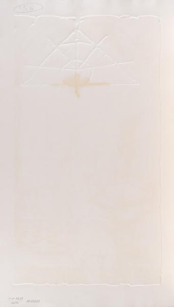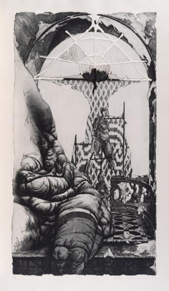 В аркоподібному прорізі елементу старої архітектури (розмір відбитка – 57.6 х 31.5 см) на мозаїчній чорно-сірій підлозі з фрагментом балюстради зображений фрагмент людської старої плоті у сидячому положенні. Позаду тіла, посередині аркуша внизу відтворено погруддя оголеної жінки, на голові якої – конструкція, що нагадує хрест. На верхній кінець «хреста» настромлена оголена жіноча фігура без рук і ніг. Її підтримує стрижневий каркас. Конструкція зображена на візерунковому тлі, яке завершується білою тисненою фрамугою.