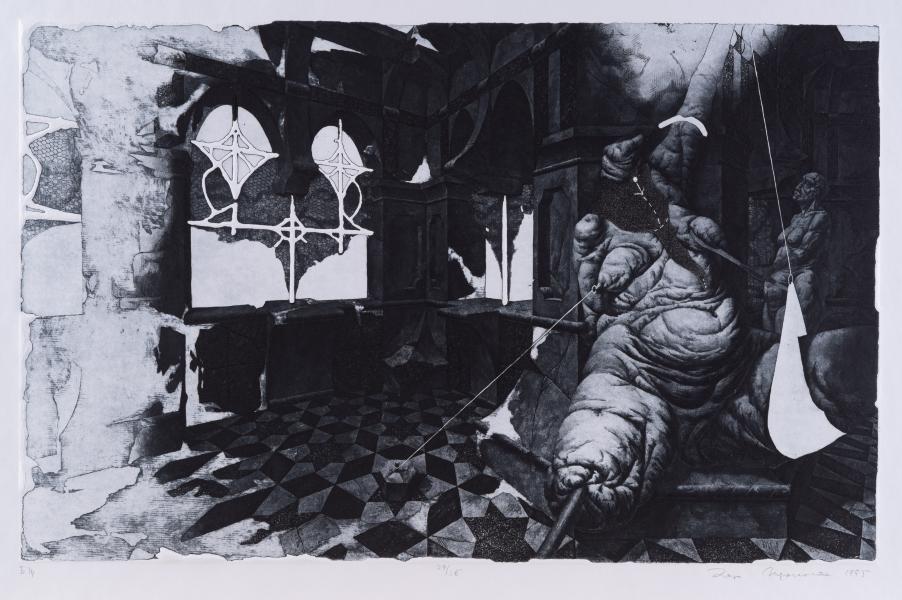 На відбитку (30.7 х 48.8 см) зображене приміщення старовинної архітектури з мозаїчною підлогою у білі та чорні зірки й ромби. У приміщенні – спарені аркоподібні вікна з решітками. Справа зображена масивна оголена жіноча фігура з широко розставленими стегнами. Голова, закінчення рук та гомілки у жінки відсутні. Її шия прикрита тканиною. Тіло жінки стрижнями та розтяжкою, прикріпленою до грудей, зафіксоване у сидячому положенні. Справа жіночої фігури стоїть постать лисої оголеної жінки, яка тримає стрижень, що впирається у груди масивної жінки.