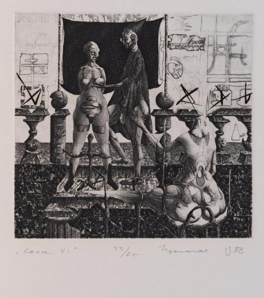 У своїй готичній подобі такі гротески відображають людські вади у їхній апокаліптичній формі – їхню справжню форму, що ховається за видимим, одкровення прихованого людського гріха, яким він постане у Судний день. Чи є видіння Подольчака у цьому фантастичному просторі репресій так само апокаліптичними, чи, можливо, вони сигналізують, що політичний острах перед орвелівськими кошмарами перетворюється на екстаз?» (Едвард Коллесс, «Есе». До каталогу виставки «Igor Podolchak. Ukrainian Printmaker», 1991).