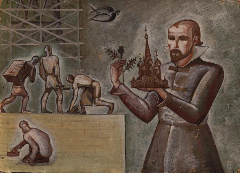Ескіз до серії розписів «Руські зодчі», виконаний Василем Польовим та Юлією Подоговою у московському Будинку архітектора. Композиція присвячена, ймовірно, спорудженню собору Покрови Пресвятої Богородиці (неофіційна назва – храм Василія Блаженного, 1555–1561 рр.). У правій частині зображена ієрархічно збільшена постать архітектора або фігура Івана IV Васильовича. Постать відтворена у вбранні, що суголосне крою чоловічого одягу, зокрема кафтанів середини XVI ст. З огляду на особливості тогочасних вікових та соціальних градацій, зображений поколінний персонаж відносно молодий, хоча й з окремими віковими змінами (інтенсивна алопеція), а його етнічна приналежність є змішаною (розріз очей, форма носа, тип вилиць), що також узгоджується з етнічним походженням Івана IV, мати якого, Єлена Глинська, мала частково азійське походження. Цей персонаж у правій руці тримає рослину, вірогідно, чортополох (лат. Carduus) або ж татарник звичайний (лат. Onopordum acanthium), а у лівій – макет собору (зображення відповідає історичним описам до перебудови, зокрема мініатюрі «Книги про обрання на царство царя і великого князя Михаїла Федоровича», 1672–1673 рр.). У лівій частині показано процес будівництва й зображено чотирьох персонажів – анонімні й максимально узагальнені постаті будівничих, які обернені спинами до глядача. Колорит композиції холодний, з окремими теплими партіями, підхід до формотворення монументальний з огляду на призначення.