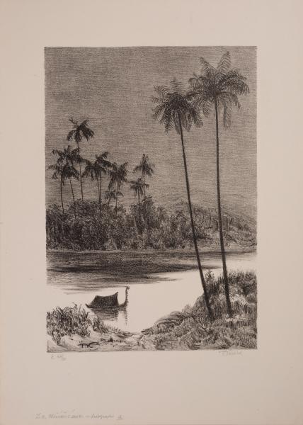 Екзотичний нічний краєвид, на якому зображені високі пальми та річка, якою пливе човен з високо загнутим носом.