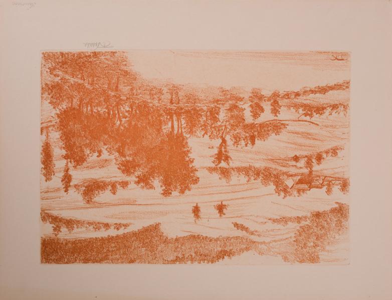 Краєвид гірського села, виконаний в реалістичній манері. На передньому плані відтворене озеро півколом біля берега, по центру – невеликі кущі. На задньому плані – рівнина, де зліва серед дерев видніються дахи будинків. Позаду видно ліс.