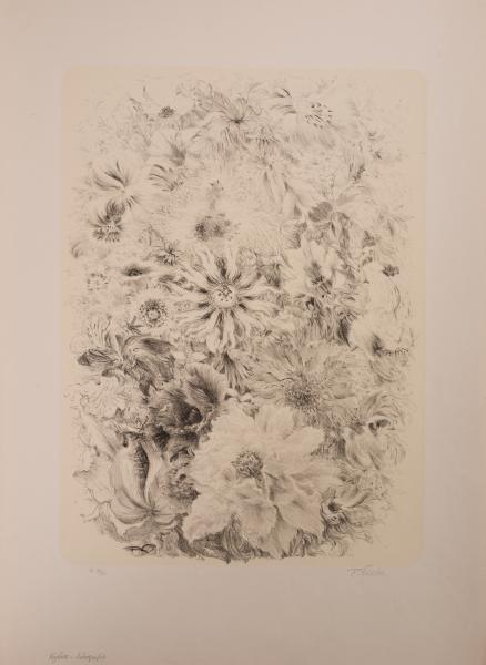 Декоративне зображення квітів, ймовірно призначене для оздоблення книги. У творі автор відобразив букет, що складається з різноманітних квітів різних видів з розкритими пелюстками.