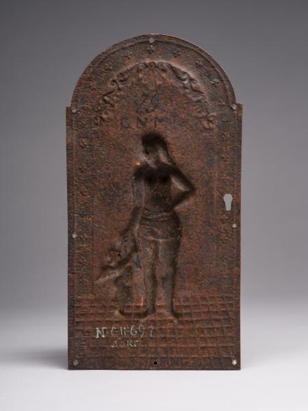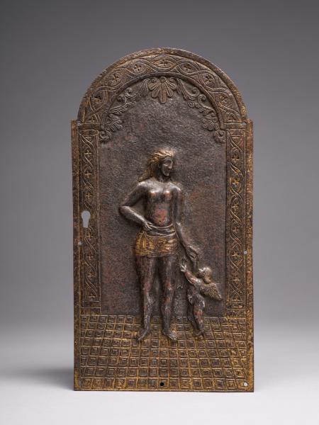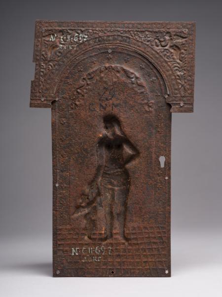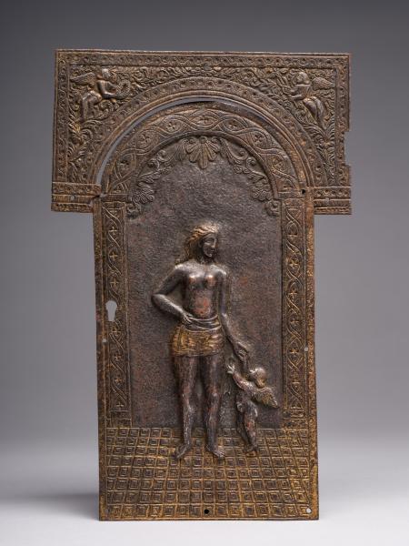 Металева фурнітура дверцят складається з двох частин: центральної (20.2 х 10.6 см) у формі арки, обрамованої орнаментальною стрічкою з замковою щілиною, та верхньої супрапорти (7.9 х 14.5 см). В центрі арки зображено напівоголену жіночу постать (Венера), до якої внизу справа припадає дитина з крильцями на спині (Амур). Фігури стоять на підлозі, викладеній облицювальними квадрами. Супрапорта з орнаментальною облямівкою на кутах прикрашена крилатими фігурами, одна з яких тримає в руках вінок, друга – кадуцей. Робота ремісничого рівня, виконана майстром на замовлення власника шафи.