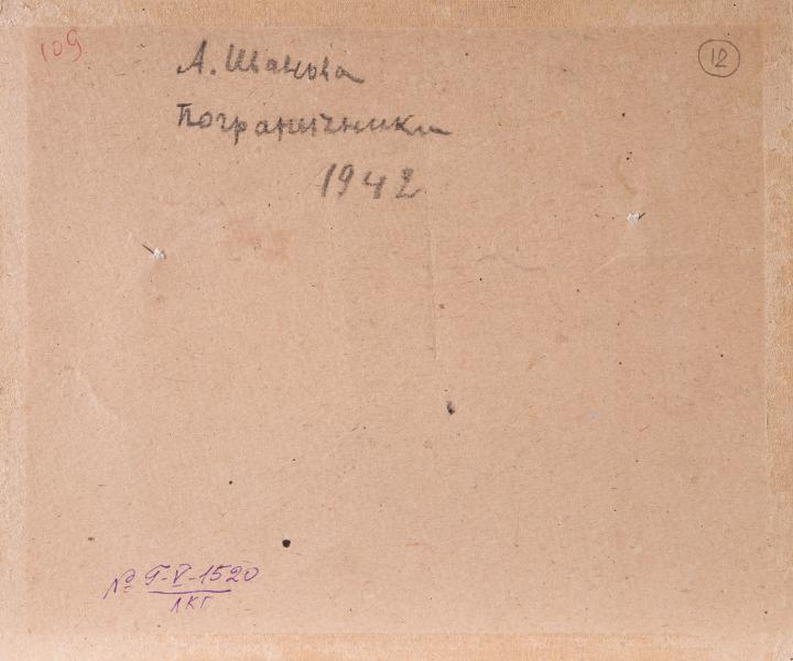 На звороті: вгорі посередині олівцем: «А. Иванова / Пограничники / 1942». Зліва вгорі в куті червоним олівцем: «109». Справа вгорі в куті простим олівцем у колі: «12». Внизу зліва фіолетовим: «№ Г-V-1520/ ЛКГ».