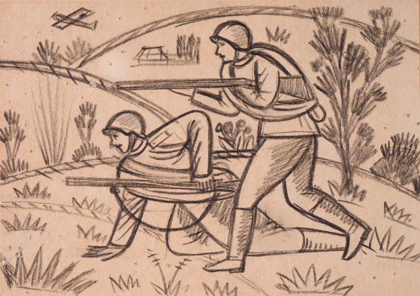 Начерк атаки бійців. Двоє солдатів з гвинтівками в руках прямують вліво – в атаку на ворога. На їхніх головах шоломи, на ногах – чоботи, через плечі перекинуті сувої шинелей. Вояк зліва зображений напівлежачи, спираючись на землю правою рукою. Сцена відбувається посеред пагорбів, де на дальньому плані вгорі схематично зображений літак. Наявність погонів в одного з бійців викликає сумнів щодо датування авторкою твору (погони в Червоній армії з’явилися тільки у 1943 році). Ймовірно, авторка підписувала свої твори пізніше, не дотримуючись хронології. Не відповідає сцена й назві твору: прикордонники мали інше спорядження і не йшли в атаку за підтримки авіації.