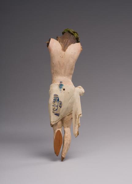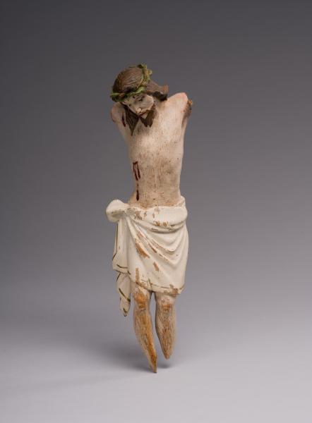 Скульптурне зображення демонструє фігуру Христа з терновим вінком на голові. Робота зазнала значних втрат – відсутні руки, нижні частини ніг, та це не заважає впізнати образ розп’ятого Христа. Його голова нахилена до правого плеча. Обличчя обрамлюють строгі лінії темного волосся та коротка клиноподібна борода. Очі закриті, на лиці вираз спокою та скорботи. Оголене тіло прикрите драперією на стегнах, зав’язаною вузлом. Різьблення нагадує тонку тканину, що спадає м’якими природними складками. Драматизму Розп’яттю додають промальовані сліди крові, яка рясними краплями вкрила чоло і частину тулуба.
