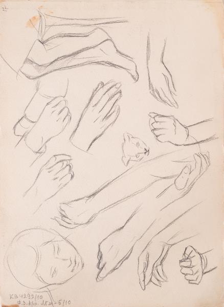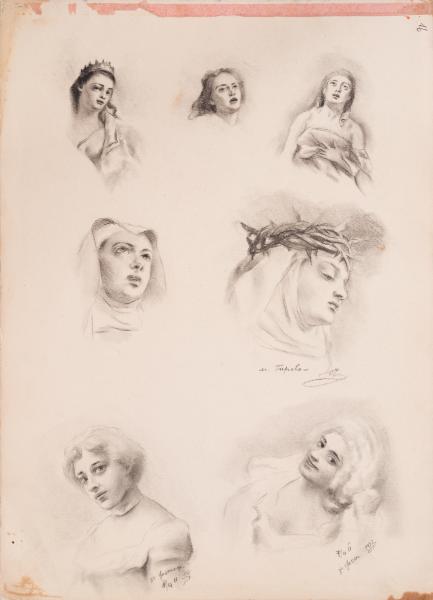 На аркуші зафіксовано серію графічних зарисовок жіночих голів та погрудь, виконаних у класичній академічній манері. Робота містить сім портретних образів, частина з яких, імовірно, є копіями або інтерпретаціями живописних першоджерел. Композиція має навчальний характер і вочевидь створена у межах студійних вправ, спрямованих на опанування анатомії обличчя, передачу характеру та експресії через засоби графіки – м’який олівець. Портрети розташовані вільно, без чіткої симетрії, що надає композиції певної динаміки та наближає її до ескізного аркуша художника-практика. Кожен із жіночих образів має індивідуальний характер – від ніжної замріяності до стриманої гідності чи екстатичного молитовного стану. Серед зображень впізнавані типажі, притаманні європейському портретному живопису кінця XVIII – ХІХ століття, зокрема мова про риси обличчя й характерне моделювання тіней, що нагадують стилістику творів авторів того часу. Одне з облич має характерний, більш суголосний до бароко типаж із драматичним поворотом голови та розфокусованим поглядом – такий типаж часто застосовують до образів святих та алегоричних жіночих образів. Інша ж жінка у терновому вінці вірогідно пов’язана з образами стигматиків, у неї стримані емоції, глибоке світлотіньове моделювання, особлива міміка, що надає обличчю психологічної глибини. Ці зарисовки демонструють дослідницький підхід автора: у манері відтворення форм є спроби не просто копіювати, а зрозуміти логіку побудови образу, а штрихування варіюється залежно від образу. Попри відсутність розбірливих авторських підписів та чітких вказівок на джерело, роботи справляють враження ретельної вправи, виконаної з метою вивчення класичної традиції портретного рисунка. На звороті зображення – серія схематичних студій рук, ніг, також є зображення голови жінки у фас та голови кота у фас, за особливістю побудови, вірогідно, виконані з натури.