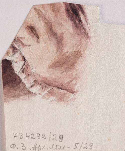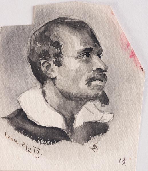 На лицевому боці представлено оплічне зображення чоловіка, виконане у техніці акварелі монохромною гамою. Портрет є прикладом навчального копіювання живописного чи графічного зразка старих майстрів, що було поширеним явищем у художній освіті кінця ХІХ – початку XX століття. Такий підхід дозволяв студентам не лише тренувати руку, а й засвоювати класичну мову побудови форми, анатомії, світлотіньової моделі та композиційної рівноваги. Зображення вирішене у погрудному форматі з чітко окресленим плечовим поясом і динамічним розворотом голови. Модель, бородатий чоловік середнього або зрілого віку, – зображений у виразній пластичній позі, з піднесеним угору підборіддям і поглядом, спрямованим вгору й убік, що надає образу ноток внутрішньої зосередженості або духовного піднесення. Така поза характерна для парадних або психологічно наснажених портретів доби бароко та класицизму, і могла бути запозичена зі зразків європейського живопису XVII–XVIII століть. Тональне моделювання виконане з глибоким розумінням об’ємно-просторової структури форми. Майстерно використана властивість матеріалу як пігменту давати гаму напівтонів і глибоких тіней: обличчя моделі виконане тонкою градацією прозорих шарів, а зони тіней, особливо у ділянці очниць, під щелепою, у западинах шиї, підсилено щільнішими плямами тону. Волосся та борода вирішені декоративно-графічною плямою з локальними затемненнями. Розмиті краї силуету та пластично узагальнене тло дозволяють зосередити увагу на психології образу. На зворотному боці аркуша наявні фрагменти іншої роботи, виконаної, ймовірно, тією ж рукою. Зображення фрагментарне й складне для однозначного іконографічного визначення – воно не містить завершеної композиції чи очевидної сюжетної підказки. Можна припустити, що це спроба окремих ескізних побудов або залишки попереднього начерку, що не були реалізовані у фінальну композицію. Такі «зворотні» фрагменти є типовими для навчальних аркушів початку XX століття, коли папір використовувався економно, а зворот часто слугував для попередніх вправ або експериментальних формопошуків. Робота засвідчує класичну академічну підготовку, притаманну тогочасній системі художньої освіти, у якій копіювання було основою вивчення спадщини старих майстрів. Виконання у техніці монохромної акварелі додатково тренувало відчуття тональності та глибини форми без залучення колористичних засобів, що було важливо для формування пластичного бачення художника.