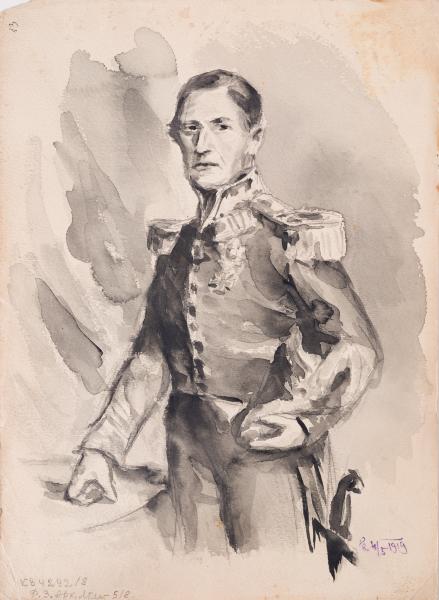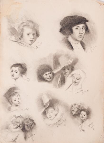 На цьому листі Юліан Заяць виконав серію графічних зарисовок із живописних творів європейських майстрів XVI–XVII століть. Шкіци, ймовірно створені у контексті навчання, є копійними студіями з портретів Ганса Гольбейна Молодшого, Пітера Пауля Рубенса, Яна Вермеєра, а фігури сатирів й німф (дріад?) – із міфологічних сцен Пітера Пауля Рубенса. Всі зображення виконані м’яким олівцем, композиція охоплює дванадцять облич, представлених у різних ракурсах і настроєвих регістрах – від дитячої безпосередності, вишуканої світськості, до діонісійного шалу. Верхня частина аркуша містить портрет юного хлопчика і молодого чоловіка в чорному береті – заможного німецького ганзейського купця Георга Ґізе, котрий на час портретування проживав у Лондоні. Їхні обличчя тонко змодельовані штрихуванням, з увагою до освітлення та анатомії, що свідчить про глибоке занурення художника в стильову манеру оригіналів. Далі – група жіночих портретів, серед яких впізнавані обидві дружини Пітера Рубенса (Ізабелла Брант і Гелена Фурман), чиї обличчя передано з характерною рубенсівською пластикою – об’ємними формами, м’якими овалами облич, емоційними поглядами. Ці зображення у практиці Юліана Зайця виразно та послідовно відтворюють дух світського портрету фламандської епохи. Особливий акцент зроблено на гротескній парі фігур у нижньому правому куті – сатир і вакханка, ймовірно, запозичені з рубенсівських міфологічних композицій. Тут художник вправляється не лише в портретуванні, а й у переданні емоційного напруження, де штрихування стає більш експресивним. До них є контрастним зображення жінки та чоловіків з полотна Яна Вермеєра «У звідниці» (1656), зокрема за характером освітлення, що моделює обличчя з лагідною тінню. Робота має виразно навчально-дослідницький характер і репрезентує глибоку зацікавленість автора в розмаїтті живописної традиції. Вміння варіювати техніку залежно від образу та джерела, уважність до деталей, робота з фактурою одягу та капелюшків – усе це свідчить про високий рівень студійної підготовки. Таке поєднання портретів з різних художніх традицій формує діалог культур і стилів, підкреслює універсальність академічного рисунка як методу освоєння класичного мистецтва. На звороті цього листа є графічна копія з офіційного фотопортрета бельгійського короля Леопольда I (1790–1865), виконана у техніці акварелі з графічною підготовкою. Образ монарха передано у тричвертному повороті, з класичною парадною постановкою: одна рука спирається на стіл, інша притримує притиснутим до корпуса головний убір, поза стримана, вивірена й гідна. Композиція підкреслює велич особи, статусність та атрибути військово-політичної влади. Король зображений у мундирі з еполетами, орденами й чітко змодельований складками тканини. Обличчя виконане м’яко, з незначним світлотіньовим моделюванням: погляд спрямований уперед, з елементом відстороненості та зосередженості, що характерно для офіційної іконографії монарших осіб середини XIX століття. Тло виконане у вільній манері – широкі плями сірих тонів обрамлюють фігуру, не відвертаючи уваги від центрального образу – цей прийом створює глибину та просторову рамку, але водночас зберігає акцент на обличчі й торсі. Композиція збалансована: від верхнього краю донизу око веде спокійна лінія рук і згин лікт