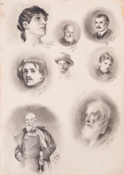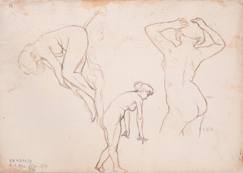 Цей лист зі шкіцами Юліана Зайця демонструє композицію з серії графічних копій – п’яти бюстових портретів та одного поколінного, що розміщені у вільному, але згармонізованому порядку. Робота виконана у техніці олівцевого малюнка з майстерним використанням тональних переходів та витонченим моделюванням об’ємів. Можемо стверджувати, що зображення зібрані у стилі візуального «альбому» – без чіткої концепції, проте об’єднані тематикою: перед нами – копії з відомих портретів авторства європейських митців XIX–XX століття, зокрема автопортрет Ежена Делакруа, інтерпретація образів Карла фон Марра та репрезентативні портрети державних діячів художника Макса Конера. Автопортрет Ежена Делакруа подано у манері, суголосній романтизму – з характерним емоційним напруженням погляду, трохи зсунутою композицією та активною роботою тону. Майстерно передано вираз очей, експресивну зачіску та виразну лінію рота, що разом формують враження енергії. Поряд – зображення, що є копіями портретів батьків Карла фон Марра. Чоловічий образ художника Джона Марра зосереджений, з опрацюванням зморшок, високим чолом, дещо суворим, зібраним поглядом, характерної форми вусами та бородою. Жіночий портрет Берти Марр з акцентом на овальності обличчя, серйозному виразі очей і майстерно штрихованому світлотіньовому моделюванні. Третя група зображень репрезентує типову для офіційної портретної практики XIX століття іконографію державних мужів: це ретельно змодельовані голови в профіль чи три чверті, з індивідуалізованими рисами – загостреними носами, суворими губами, високими чолами. Згідно з підписами, це копії з робіт Макса Конера – німецького портретиста. У цих образах акцент і на психологічній глибині, і на символічності персоналій Максиміліана Шумана та суперінтенданта Гільдебранта. Загалом композиція листа демонструє не лише технічну вправність у копіюванні живописних джерел, а й уважне прочитання стилістичних особливостей різних авторів. Попри вторинність матеріалу, графічна інтерпретація має свою пластичну мову: злагоджену, врівноважену, виконану з повагою до оригіналу. На звороті листа розміщено три фігурні студії жіночого оголеного тіла, виконані у класичній академічній манері. Рисунки зроблено чорнилом (сепією) на папері, з акцентом на лінійну чіткість, пропорційність та вивірену пластику фігури. Усі три пози демонструють рух та складні ракурси у контексті побутових чи натурних. Фігура ліворуч сидить, але розташована на листі під кутом 90º до інших, з нахиленою головою, руками, які дотикаються до гомілок. Попри статичність, поза передає напругу хребта, гнучкість ніг і лінії спини. Шкіц позначений уважністю до м’язових переходів – тут анатомічність поєднано з певною художньою умовністю: окремі ділянки, наприклад, кисті чи стопи, позначені лише легкими лініями або опущені повністю, щоб акцентувати на загальному ритмі тіла. Центральна жіноча постать напівзігнута, наче щойно схилилась або прагне підняти щось з підлоги. Композиція дозволяє оглянути тіло у тричвертному повороті, з чітким рисунком лінії хребта, сідниць, напружених м’язів. Третя фігура праворуч зображена зі спини – це наймасивніша постать у композиції. Плечі широко розведені, обидві руки заведені за голову – жест, що відкриває всю спину та дозволяє художнику ретел