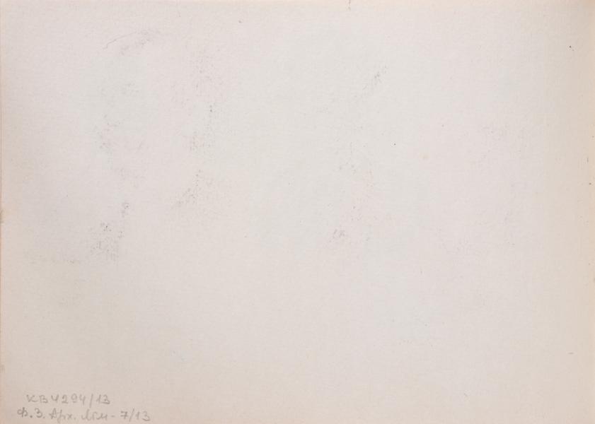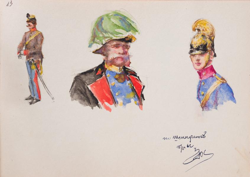 Акварельний лист із зображенням трьох чоловіків у військових мундирах є стилістично узгодженою, виважено скомпонованою групою з акцентом на типажі та деталі одностроїв. Автор оригінальної роботи наразі не встановлений, сигнатура не надто читабельна, однак художня манера свідчить про добру технічну підготовку й зацікавлення в історико-костюмному матеріалі. На передньому плані ліворуч відтворена фігура на повний зріст: військовий у мундирі темного кольору, у штанах з широкими червоними лампасами, взутий у високе взуття, на боці шабля. Позування з легким розворотом корпуса, поза врівноважена, з акцентом на поставу та ознаки приналежності до армії, можливо, періоду кінця ХІХ – початку XX століття. Центральна частина композиції відведена оплічному портрету літнього військового з пишними сивими вусами. Вбрання та головний убір свідчать про високий чин, можливо, генералітет. Увага зосереджена на рисах обличчя: вольове обличчя, виразний погляд, що додає психологічної глибини образу. Праворуч – портрет молодшого за віком військового у головному уборі з «гребенем». Його уніформа вирізняється блакитним кольором, можливо, парадного зразка. Уважна опрацьованість плям та обмежена, але влучна палітра свідчить про добре знання художником техніки акварелі. Загалом робота справляє враження дослідження військових образів і форм з опорою на прототип того часу. Попри невстановлене авторство джерела копіювання, аркуш має мистецьку й іконографічну цінність, демонструє інтерес до наративного потенціалу портрета та типологічної варіативності у зображенні військових.