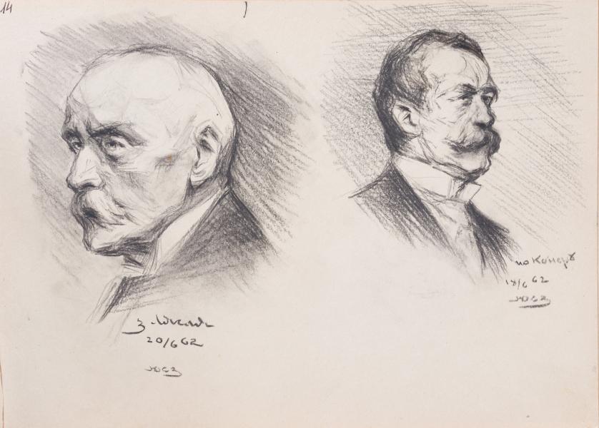 Дослідницький рисунок за мотивами творів мистців Лясля (?) та Конера (?) репрезентує уважне студіювання чоловічих портретних типажів, притаманних європейському академічному живопису другої половини ХІХ століття. На аркуші зображено двох чоловіків – обох в оплічному форматі з ракурсами, близькими до профільного положення, що надає змогу глядачеві сконцентруватися на характері ліній обличчя, формі черепа, зачісках, вусах, міміці, одязі та загальному силуетному зчитуванні. Перший портрет належить до зрілого чоловічого типажу. Зображений літній чоловік із виразними рисами віку: сиве розріджене волосся із залисинами, ретельно підстрижені вуса, серйозне обличчя з правильною геометрією. Його вбрання – класичний костюм з коміром – підкреслює соціальну належність до середовища освіченої бюрократії або академічної інтелігенції. Погляд спрямовано трохи вбік, емоційний стан персонажа врівноважений, навіть стриманий, що відповідає стилістиці офіційного портрета того часу. Художник детально відтворює анатомічну структуру обличчя, приділяючи особливу увагу носові, вилицям, формі вух і посадці очей. Другий персонаж – чоловік середнього віку з густим темним волоссям, пишною зачіскою та розкішними вусами. Образ містить елементи підвищеної репрезентативності: фрак, біла сорочка з високим стоячим коміром, що був популярним у чоловічій моді кінця ХІХ – початку XX століття. Контури обличчя м’яко, але чітко прописані; форма носа, лоба, підборіддя позбавлена гротеску, автор рисунка надає перевагу типологічній точності. Обидва портрети витримані у стриманій академічній манері з помірною світлотіньовою моделлю, добрим знанням анатомії й делікатною передачею вікових ознак. Ці рисунки, вірогідно, є частиною більшого дослідницького циклу, виконаного автором копій з метою глибшого вивчення європейської портретної традиції. Існує висока ймовірність, що вони слугували підготовчим матеріалом для подальших мистецьких пошуків та оригінальних творів самого художника. Така практика копіювання з робіт майстрів попередніх епох була поширеним методом. У цій графічній роботі відчутна не лише вірність джерелам, а й намагання осмислити їх у власному ключі: автор не механічно репродукує портрети, а навпаки свідомо зосереджується на ключових особливостях кожного образу, вибудовує візуальне дослідження, що поєднує академічну школу рисунка з глибоким інтересом до соціально-історичного контексту.