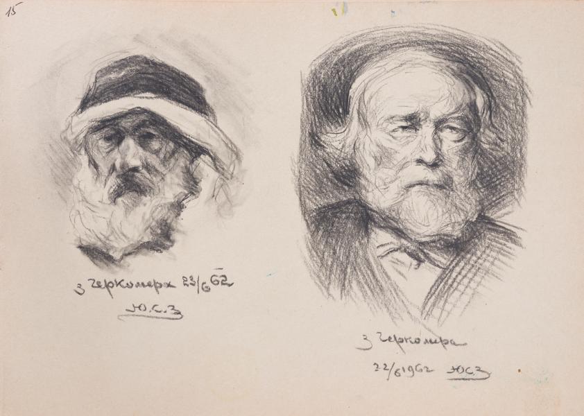 На листі бачимо копії рисунків за мотивами творів Губерта фон Геркомера, зокрема студія голови араба та оплічний портрет літнього чоловіка з сивою бородою середньої довжини. Обидві є прикладами уважної та глибокої аналітичної роботи, що виходить за межі простої навчальної вправи. Обидва зображення виконані в дусі портретного реалізму другої половини ХІХ століття, з характерною увагою до психологічної виразності й тонкої пластичної розробки обличчя. Автор копій прагне не лише технічно точно відтворити образи, а й увійти у контакт із манерою Г. Геркомера, що поєднує строгість академічного малюнка з емоційною насиченістю і глибоким гуманістичним баченням. Перша студія, голова чоловіка арабського походження, привертає увагу спокійною гідністю та силою характеру. Обличчя зображене майже у фас, з незначним поворотом, що дає можливість передати об’єм і глибину моделювання. Автор рисунка детально опрацьовує риси: темні очі, чітко окреслені брови, фактурну поверхню шкіри, обрамлення обличчя традиційним головним убором. Це зображення – не просто етнографічна замальовка, а спроба передати цілісність індивідуального образу, внутрішню зосередженість і відчуття гідності, що характерно і для самого Г. Геркомера. Другий портрет – літній чоловік з виразною сивою бородою середньої довжини, у класичному костюмі з білою сорочкою та тканим метеликом, також показаний у фас, з легкою асиметрією повороту голови. Художник акцентує на м’якій передачі об’єму, використовуючи тонкі переходи світла і тіні, що дозволяє досягти відчуття присутності. Лоб високий, очі зосереджені, погляд спокійний. Обличчя не містить надмірної експресії, а обраний ракурс і композиційне рішення дозволяють розкрити не лише зовнішність, а й певну філософію портретного образу, що було властиво Г. Геркомерові як мистцю. Губерт фон Геркомер знаковий своїми глибоко психологічними портретами, що поєднували соціальну чутливість із майстерністю академічного рисунка. Його манері притаманна пластична виваженість, скрупульозне вивчення моделі, тонке світлотіньове моделювання та увага до людської індивідуальності, незалежно від походження, професії чи соціального статусу зображуваних. Г. Геркомер часто зосереджувався на постатях, які втілювали гідність у простоті, внутрішню силу, часто тиху героїку звичайного життя. Копії, про які йдеться, очевидно є результатом не навчального інтересу, а частиною глибшого авторського дослідження. Художник, що їх виконав, прагнув не тільки повторити майстерність Геркомера, а й осмислити її в контексті власного творчого пошуку. Таке студіювання, особливо облич із різних культурних та вікових типажів, могло слугувати основою для побудови персональної іконографії у власній практиці. Таким чином ці рисунки – своєрідне «вхідне дослідження”» до майбутньої авторської системи образів, де портрет стає не стільки фіксацією зовнішності, скільки носієм досвіду, характеру та часу.