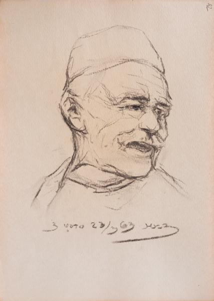 Графічна робота Юліана Зайця, створена за мотивами оплічного фотопортрета літнього чоловіка, ймовірно медика, вирізняється тонким балансом між уважним відтворенням документальної натури та індивідуальною стилізацією. Модель зображено в характерному для медичної професії головному уборі, але, можливо, ця інтерпретація не остаточна. Вуса та виразні риси обличчя формують впізнаваний та яскравий портретний тип. Чоловік поданий у момент живого спілкування – обернений корпусом, погляд спрямований у бік співрозмовника, зафіксований у ту мить, коли вимовляє слова. Цей ракурс надає зображенню динаміки та ефекту миттєвого «знімка з життя». Ю. Заяць працює з характерною для нього стриманою, але виразною лінією: точний контур окреслює силует голови та плечей, а тонке штрихове моделювання передає об’єм, м’які тіні й фактуру обличчя. Особливу увагу приділено деталям, фактурі вусів, м’якому приляганню тканини головного убору. Завдяки стилізаційному підходу мистця у відсіченні випадкових деталей фону та одягу зображення набуває портретної цілісності й зосередженості на психологічному стані моделі. Робота поєднує репортажну безпосередність моменту з відчуттям глибокої поваги до професійної та людської індивідуальності зображеного.
