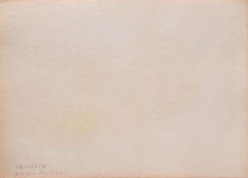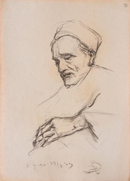 На листі зображено портрет чоловіка старшого від середнього віку, виконаний вуглем. Згідно з авторським підписом, роботу здійснено за фотографічним джерелом. Зображення має узагальнений характер: лінійно промальована голова чоловіка з бородою (?), у головному уборі. Обличчя схилене дещо вниз, що надає моделі зосередженого та замисленого вигляду. Основний акцент зроблено на окресленні силуету та основних пропорцій, без докладної розробки фактури та світлотіньового моделювання. Лінія плечей лише позначена. Особливу увагу художник надав передньому плану, де реалістично промальовано кисть лівої руки, що відтворена значно детальніше, з анатомічною точністю та тональним підкресленням об’єму. Контраст між узагальненістю обличчя й натуралістичністю руки підкреслює дослідницький характер етюду, спрямований на порівняння різних ступенів опрацювання деталей у межах однієї композиції. Таким чином, рисунок поєднує ознаки копійної практики за фотографією та навчально-дослідницького завдання, а композиційна структура свідчить про інтерес художника до варіативності у трактуванні образу: від умовного, майже схематичного обрису голови до виразної, анатомічно вивіреної деталізації руки.