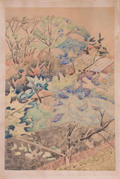 Акварельний малюнок сірих, зелених, синіх і коричневих тонів. Серед густих крон дерев і кущів зображена хатинка коричневого кольору з перекошеною стріхою, віконцями та дверима, що ледь проглядаються у густих заростях. На передньому плані видніється смужка ріллі чорно-сірого кольору, на задньому плані – дах великої будівлі.