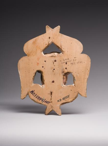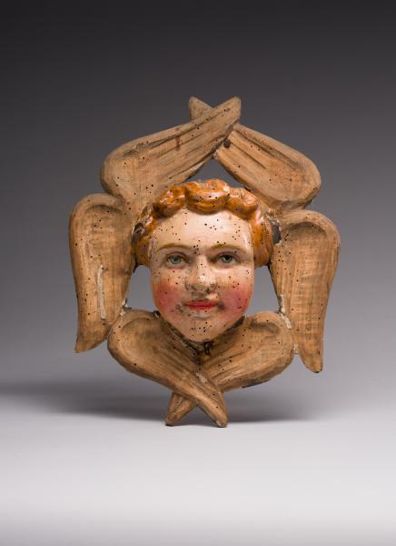 Різьблена дерев’яна голівка шестикрилого серафима є типовим мотивом у мистецтві, який використовували для оздоблення інтер’єрів сакральних споруд. Світле чітко пророблене обличчя ангельською голівки має виразні риси. Великі сіро-зелені очі з легким блиском, підрум’янені пухкі щоки, виразні вуста з ніжною усмішкою дарують відчуття лагідності та небесного спокою. Гармонійно підкреслені поліхромією риси обличчя поєднують дитячу безпосередність і ангельську гармонію. Виразності образу надають акуратно вкладені завитки світло-каштанового волосся, що обрамлює обличчя. Серафим постає як символ небесної радості та спокою, а м’які округлі риси нагадують невинність дитинства. Крила, складені навколо голови, утворюють декоративний ореол, який створює відчуття польоту та небесного сяйва. Пластично вирізьбленим крилам руху додають глибокі лінії, що імітують пір’я.