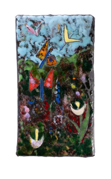 На мідній пластині зображені дві білі серпоподібні квітки, над якими літають метелики.