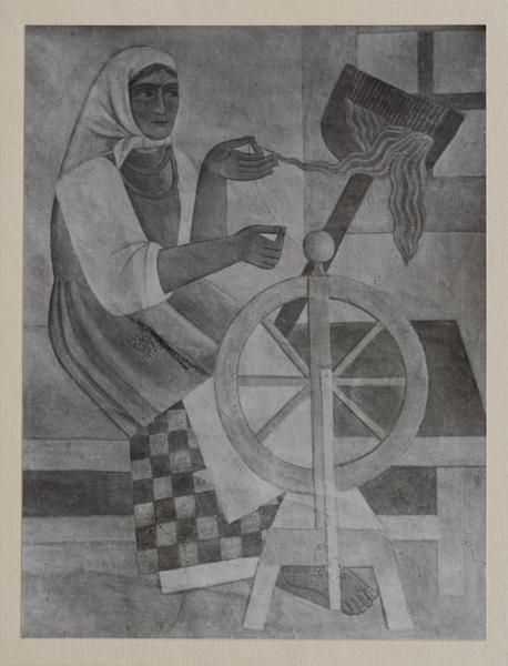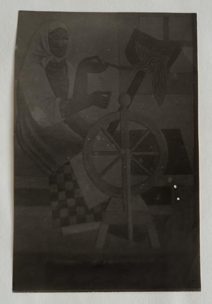 The partly Ukrainian, partly russian simple pencil inscription under the photo reads: "Ivanova A. M. Priaha (Spinner). 1918. Kyiv. Tatarka. Studio of M. Boichuk". The original of this work by the artist is in the collection of the National Art Museum of Ukraine and is entitled "Prialia" (Spinner) (mid-1920s, canvas, tempera). Given the differences in title and dating, it is advisable to conduct additional research on the original to establish the reliability of the information and to make appropriate corrections either in the information accompanying the photograph from Antonina Ivanova's archive or in the attribution of the painting. In addition, concerning the original work, it should be noted that this work has similar compositions by Oksana Pavlenko (Sketches of "Spinner", 1921, Central State Archive-Museum of Literature and Art of Ukraine) and Volodymyr Favorskyi (woodcut depicting a woman spinning, 1921), as well as a very similar detail of Antonina Ivanova's painting in the dining room of the engineer Lukin, known from a photograph from the artist's archive, which is kept in the Gallery's collection.