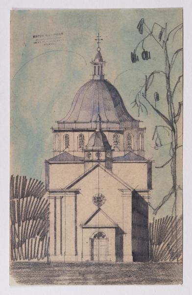 A drawing of the church in the village of Dmytriv, Radekhiv district, Lviv region. The project for the reconstruction of the Church of the Ascension of the Holy and Life-Giving Cross was created by the architect in 1936 and implemented in 1939 (Lev Kh., Slobodian V., Filevych N. 100 Churches of the Nahirnyi family. Part Two: Churches of Yevhen Nahirnyi. Lviv, 2015. P. 125).