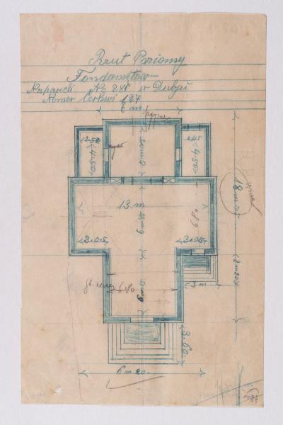At the top is an inscription in Polish in blue pencil: "Horizontal projection of foundations On parcel № 281 in Dubie Number of the church 127".