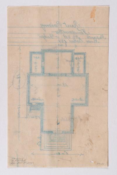Drawing of the plan with calculations for the project of the wooden church of St. John the Apostle in the village of Dubie, Brody district, Lviv region. The church was designed by Yevhen Nahirnyi in 1933 (Lev Kh., Lev V. (the Younger), Filevych N. Nahirni, Levy: Family History. Lviv, 2000. P. 141).