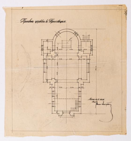 In the upper left is an inscription in ink: "The church project in Prysivtsi". In the middle right is an inscription in ink: "Lviv 10.X.1929 engineer / signature / Yevhen Nahirnyi".