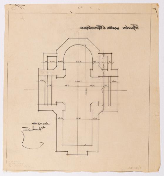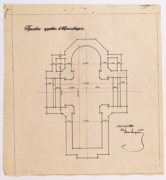 The picture shows the Church of the Nativity of the Blessed Virgin Mary in the village of Prysivtsi, now in the Ternopil district of the Ternopil region. It is a single-nave brick building with a rounded altar, a small transept, and two sacristies. The interior has flat wooden floors and a choir loft-triforium accessed by a spiral staircase. The church has a gabled tin roof and a wooden dome over the central part. The style uses restrained classicist elements (entrance portal, simplified attics with acroterion flowerpots) and forms of traditional wooden church construction (dome). The project was designed in 1929 and completed in 1939. Today (2024), the church is preserved, and its dome is made of stone. The figure shows a cross-section of the church, including the ceilings, roof and dome structures.