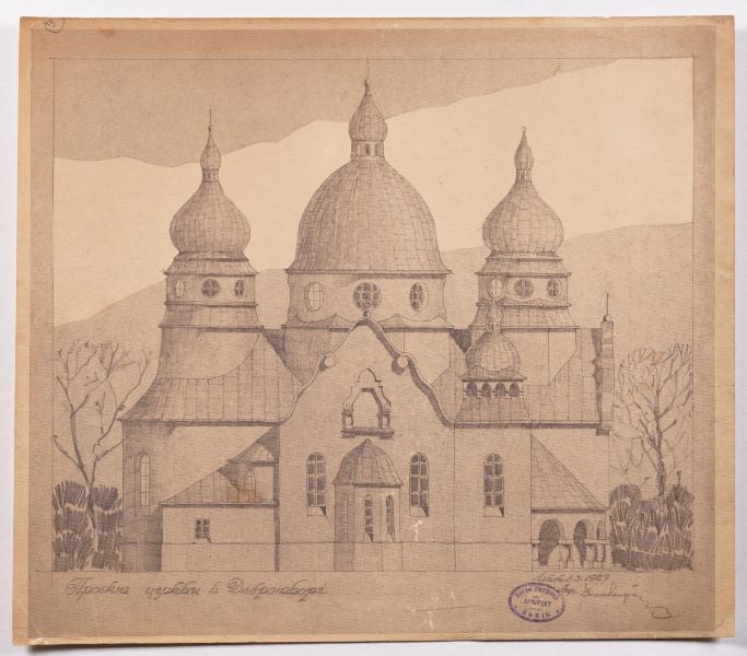 The picture shows the Church of Sts. Volodymyr and Olha in the village of Staryi Dobrotvir, now in the Chervonohrad district of the Lviv region. It shows the northern facade of the church, which was designed in 1927 but never completed. The design of the church combines the features of Byzantine stone churches and wooden three-level churches. The Byzantine influence is evident in the layout: the footprint is similar to a square, there are three naves, each ending in a semicircular apse, and the central nave is longer than the side ones. The interior has four pillars that support the central dome. According to the plans, the church was to have three domes – a larger stone central dome and smaller wooden ones on the same longitudinal axis. Initially, in 1927, the architect designed a church with bright Art Deco features. Still, in 1935, he simplified the project by applying more restrained forms of classicism without changing the overall three-dimensional solution of the building. The project was completed between 1933 and 1938. The church is still standing today (2024).