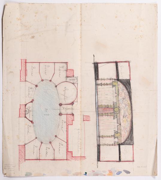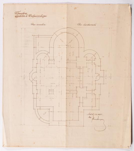 The picture shows the Church of Sts. Volodymyr and Olha in the village of Staryi Dobrotvir, now in the Chervonohrad district of the Lviv region. The plan of the church's foundations is depicted here. The design of the church combines the features of Byzantine stone churches and wooden three-level churches. The Byzantine influence is evident in the layout: the footprint is similar to a square, there are three naves, each ending in a semicircular apse, and the central nave is longer than the side ones. The interior has four pillars that support the central dome. According to the plans, the church was to have three domes – a larger stone central dome and smaller wooden ones on the same longitudinal axis. Initially, in 1927, the architect designed a church with bright Art Deco features. Still, in 1935, he simplified the project by applying more restrained forms of classicism without changing the overall three-dimensional solution of the building. The project was completed between 1933 and 1938. The church is still standing today (2024).