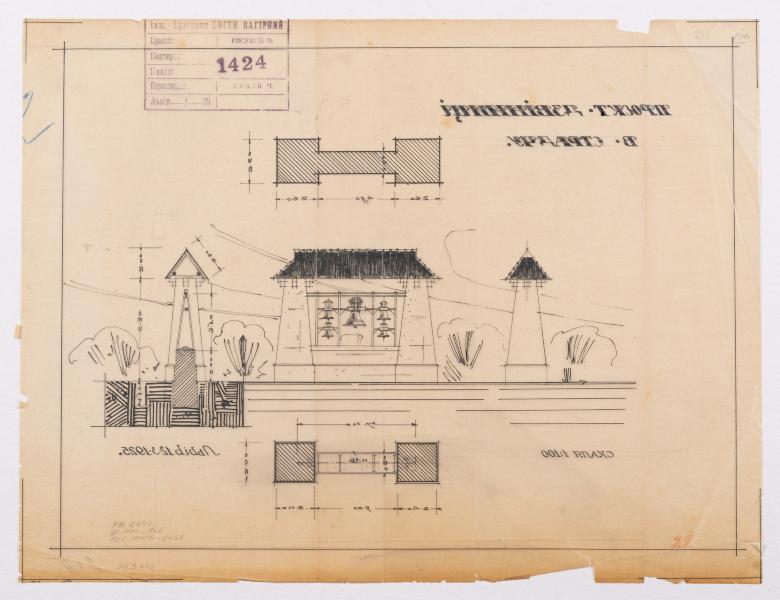 In the upper left is an inscription in ink: "Project of the bell tower in Stradch". In the lower left is an inscription in ink: "Scale 1:100", in the lower right an ink inscription: "Lviv 12.3.1925". On the back of the drawing is the stamp "Engineer-Architect Yevhen Nahirnyi", in which the columns "Project", "Estimate", "Copy", "Reviewed", "Lviv____/____", and "Archive ch. ___" are not filled in. The column "Figure" has the number "1424" filled in.
