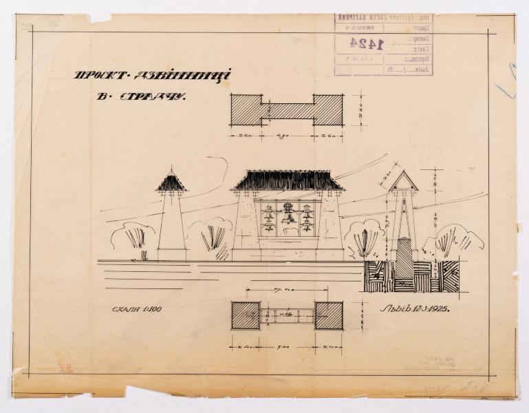 The drawing shows the wall bell tower of the Church of the Assumption of the Virgin Mary in the village of Stradch. It is a simple masonry structure, about 8 metres high, consisting of two pillars on a foundation and a small roof. The project was not carried out (Lev Kh., Slobodian V., Filevych N. 100 Churches of the Nahirnyi family. Part Two: Churches of Yevhen Nahirnyi. Lviv, 2015. P. 128).