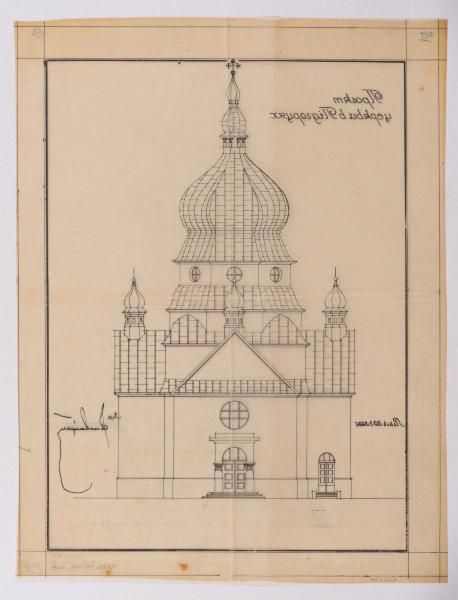 The drawing shows the design of the stone church of the Cathedral of Saint Archangel Michael in the village of Pidhirtsi. The picture depicts the main entrance facade in a slightly different version than the one that was realised (the octagon contains an additional hall). It is a single nave building with a transept, a semicircular apse, and two sacristies. A dome (octagonal on a quadrangle) rises above the crossing, and ridge turrets are on each of the four sides of the roof. The church is decorated in the Art Deco style, and the author followed Baroque models in the shape of the dome. The project was completed between 1932 and 1939 (Lev Kh., Slobodian V., Filevych N. 100 Churches of the Nahirnyi family. Part Two: Churches of Yevhen Nahirnyi. Lviv, 2015. P. 48).