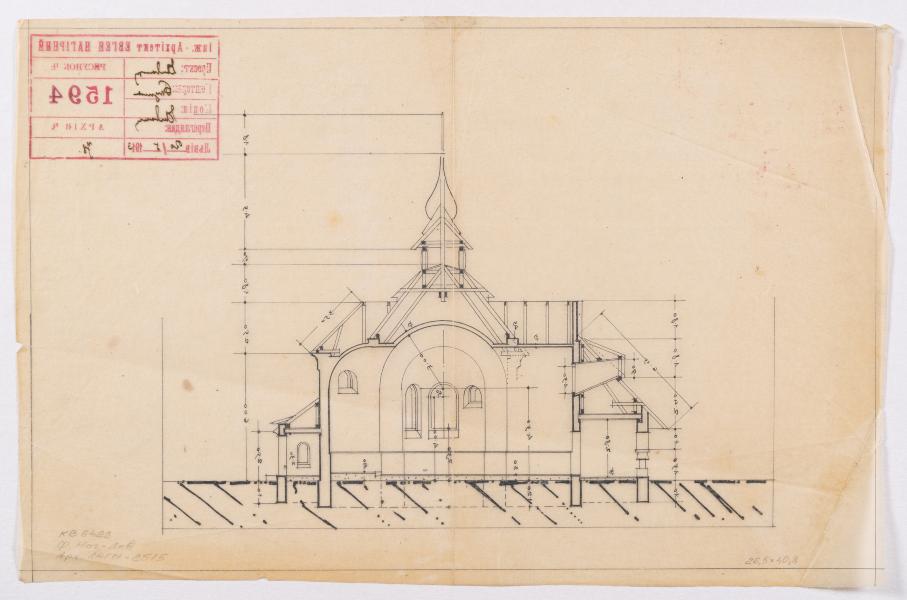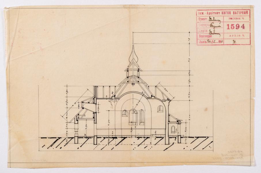 The drawing shows a longitudinal section of the stone church of the Nativity of the Blessed Virgin Mary in the village of Khlopy (now the village of Peremozhne). This drawing belongs to the first design of the church from 1913. Some of the drawings were made in 1927 and 1933. The construction was finished in 1938. According to the drawings of 1913, the church was designed as a church with a centric plan, surrounded by arcades on three sides. The building was to have a hipped roof with a ridge turret above the crossing. However, the church was built differently, with a dome on a round tholobate (Lev Kh., Slobodian V., Filevych N. 100 Churches of the Nahirnyi family. Part Two: Churches of Yevhen Nahirnyi. Lviv, 2015. P. 108).
