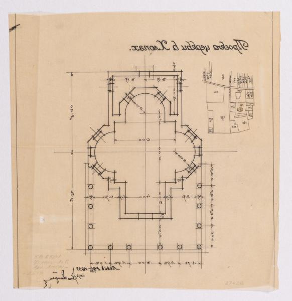 The plan of the stone church of the Nativity of the Blessed Virgin Mary in the village of Khlopy (today Peremozhne) from 1933 (versions from 1913 and 1927 preceded these drawings). The construction was finished in 1938. According to the drawings of 1913, the church was designed as a church with a centric plan, surrounded by arcades on three sides. The building was to have a hipped roof with a ridge turret above the crossing. However, the church was built differently, with a dome on a round tholobate (Lev Kh., Slobodian V., Filevych N. 100 Churches of the Nahirnyi family. Part Two: Churches of Yevhen Nahirnyi. Lviv, 2015. P. 108).